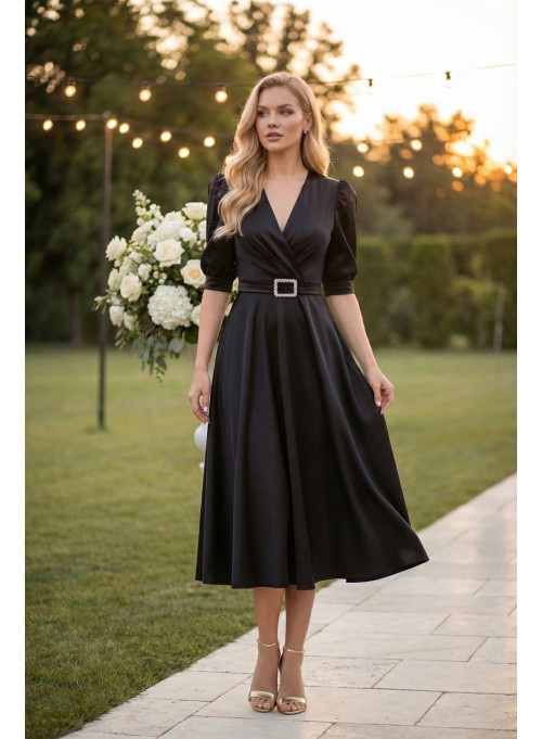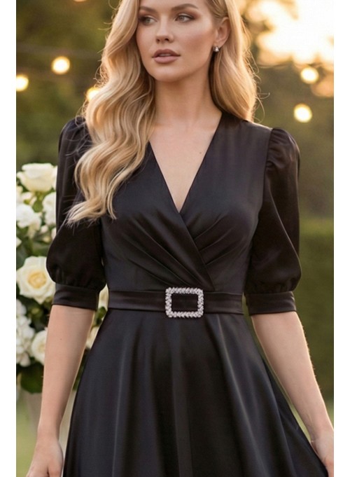 O rochie neagra statement, realizată din tafta cu căptușeală milanez, care pune în valoare silueta prin închiderea reglabilă tip corset și cupe inserate pentru susținere perfectă.