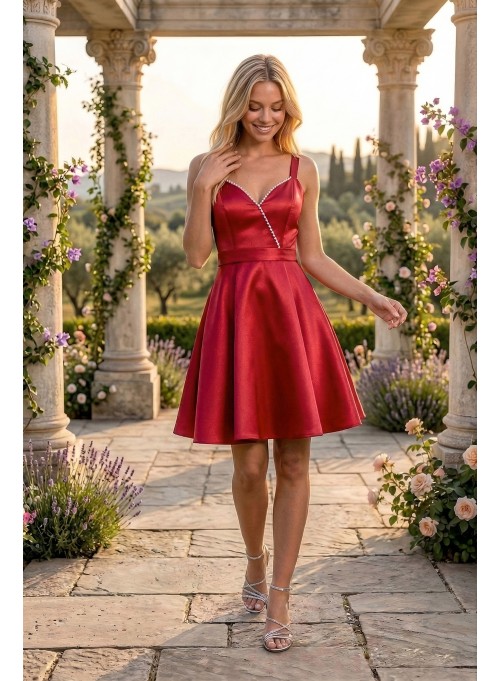 O rochie rosie statement, realizată din tafta cu căptușeală milanez, care pune în valoare silueta prin închiderea reglabilă tip corset și cupe inserate pentru susținere perfectă.