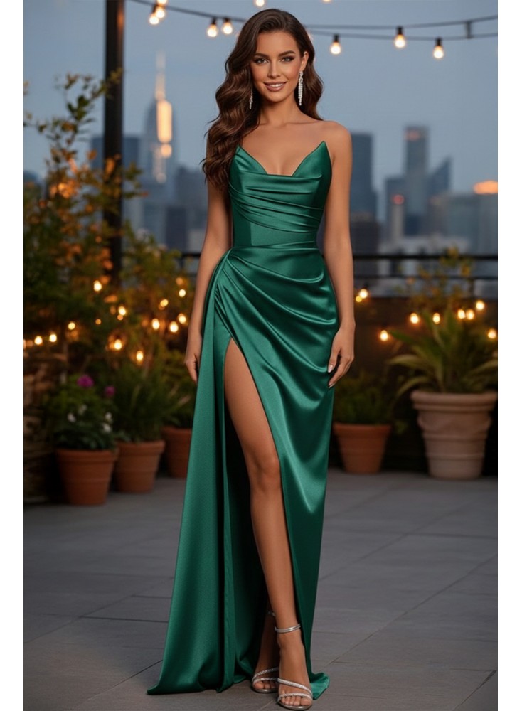 O rochie verde statement, realizată din tafta cu căptușeală milanez, care pune în valoare silueta prin închiderea reglabilă tip corset și cupe inserate pentru susținere perfectă.